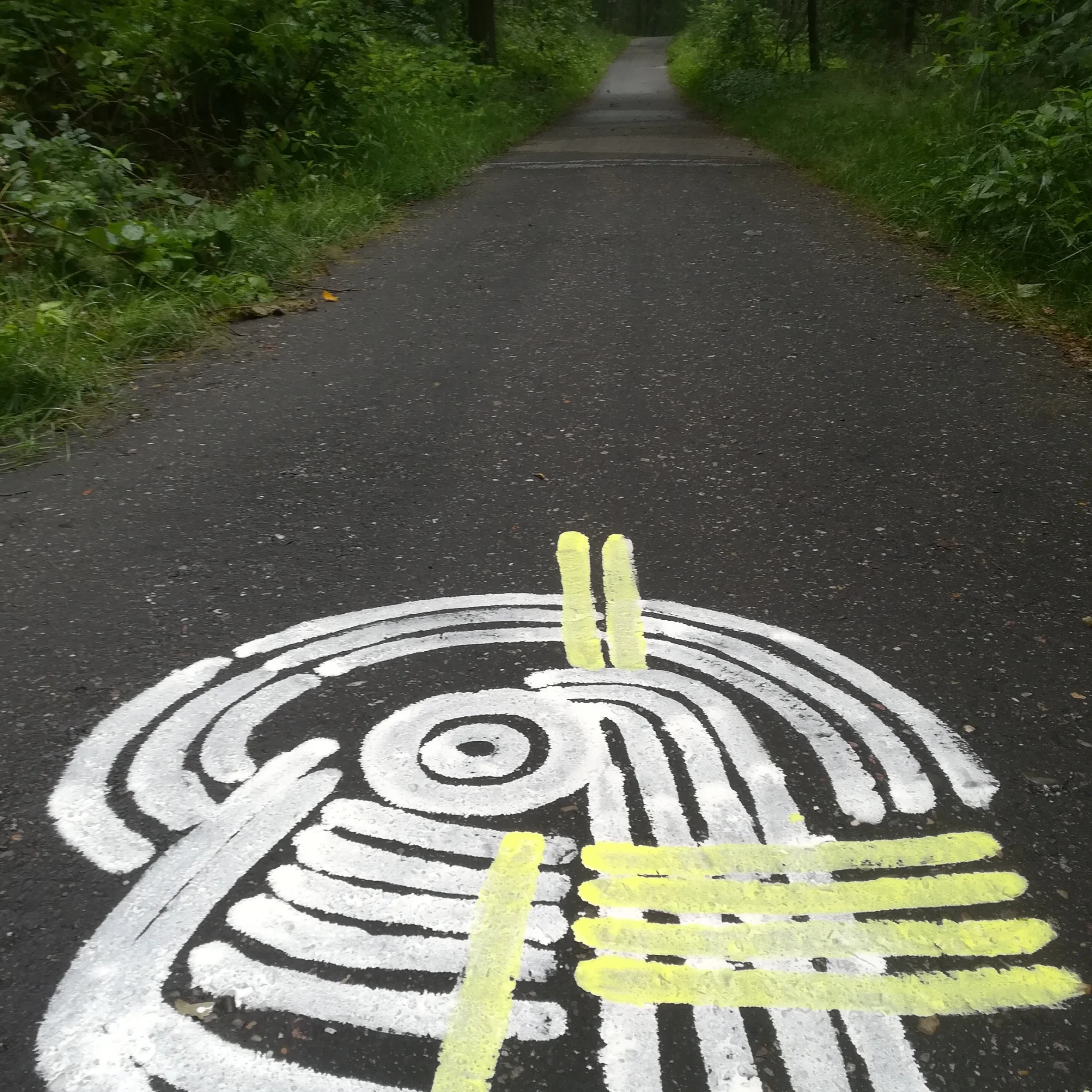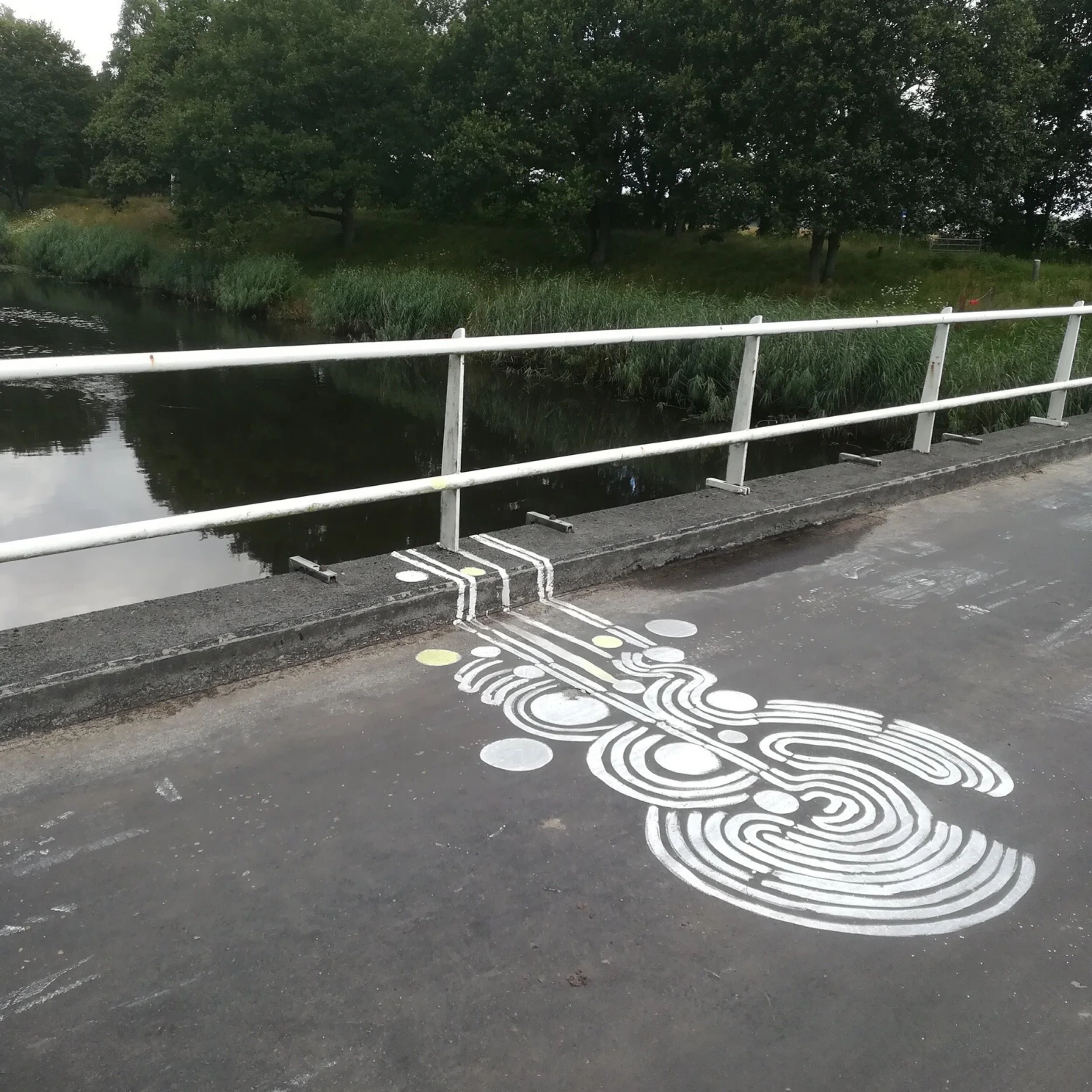 Een Hemels Landschap. Levensgrote witte lijntekeningen op wanden, bruggen en stoepen, geschilderd met kaolien klei. Ze verbinden hemel en aarde. Drie weken lang zijn de tekeningen zichtbaar, waarna de klei oplost en terugkeert naar de aarde, als onderdeel van het proces.